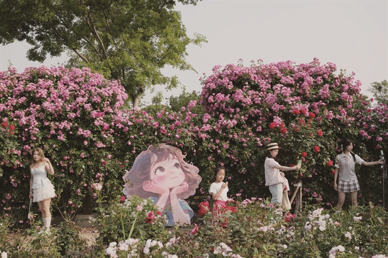 近日,在杭州滨江区白马湖公园,蔷薇花陆续开放。花瓣如瀑布般倾泻而下,恍若进入了莫奈笔下的油画世界。图为昨日,市民在白马湖公园拍照留念。