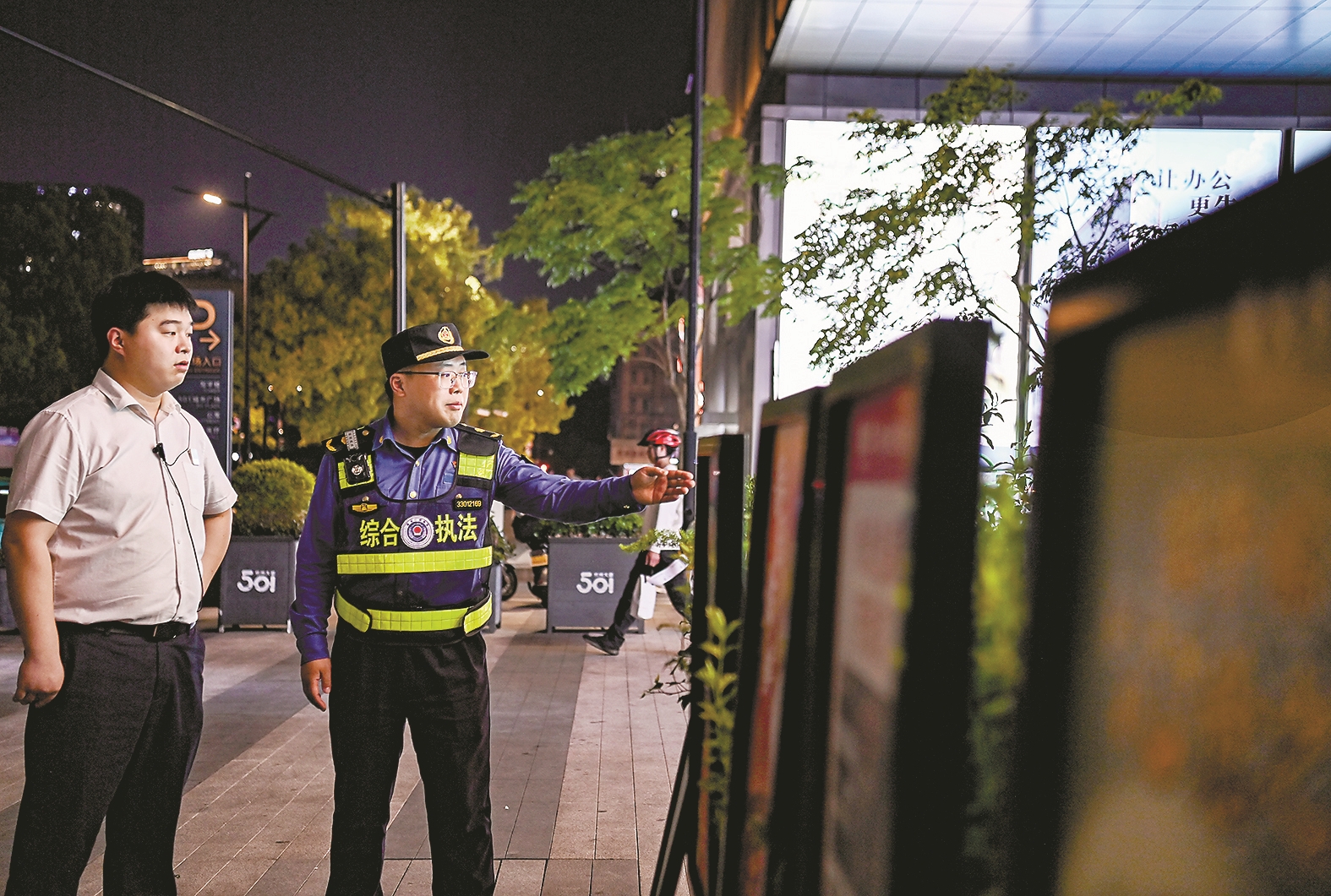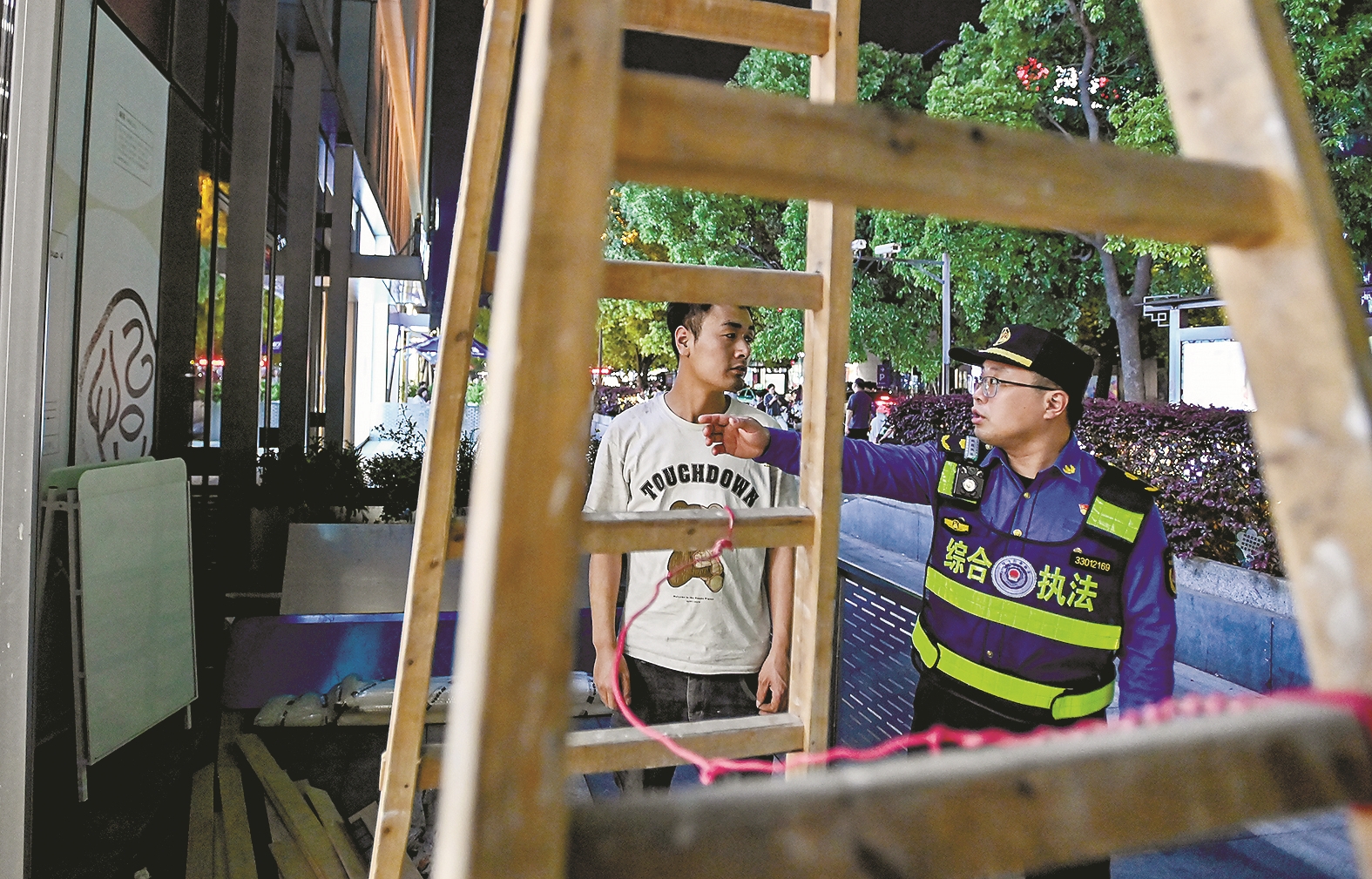 晚上7点半,杭州大厦501城市广场的霓虹照亮熙攘人潮,沿街店铺外摆餐桌飘来阵阵饭香。上城区综合行政执法局四季青执法中队副中队长李月江的藏蓝色制服,在流动的人群中格外显眼。他时而停在正在装修的玻璃门前,时而俯身与商户交谈,口袋里的执法记录仪闪烁着红光,记录着这座城市夜晚的烟火与温度。