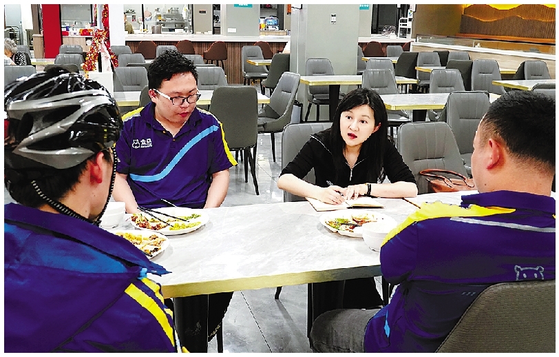 12:30过后,身穿各色工作背心的外卖配送员三三两两结伴而来前来就餐。这个时候也是“工会驿站”站长最重要的工作时间——通过有效沟通了解一线小哥们的需求和困难,经过梳理之后上报给工会组织。