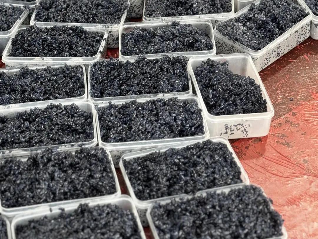 一眼望去,最显眼的便是竹匾里堆着小山似的乌饭树叶,阿婆们围坐在一起,手指头在绿叶间翻飞,选出最新鲜的叶片,掐断叶柄时带起清苦的草木香。“老叶要掐掉,汁水发苦,嫩梢留着,最出颜色。”经验丰富的阿婆边说边掐,分拣好的叶子被抖得簌簌作响。