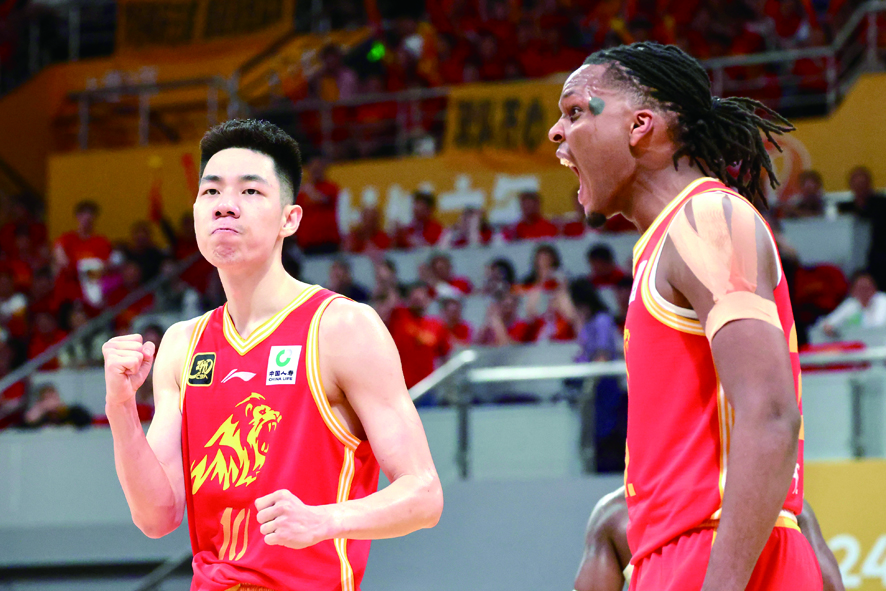 广厦队进球后朱俊龙(左)和卡尔顿庆祝 记者 夏阳 摄