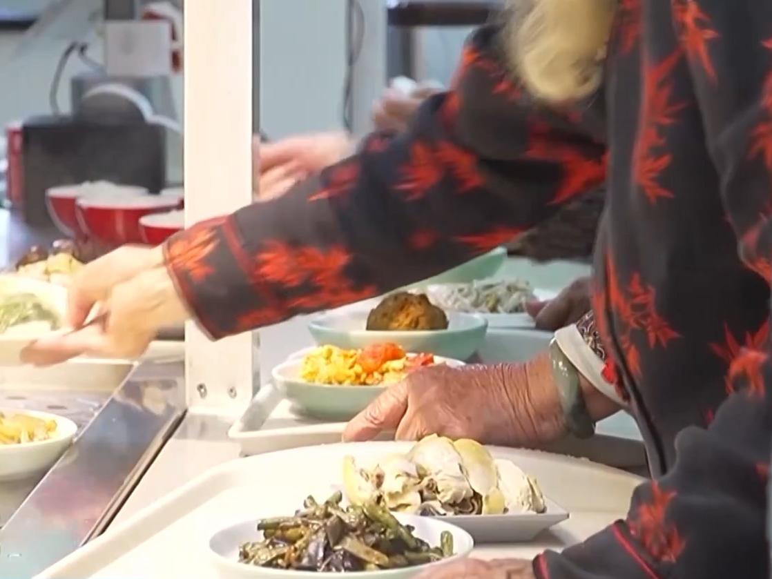 上午11点,馒头山社区食堂内,各式家常菜冒着香气,不少老人在排队打菜。