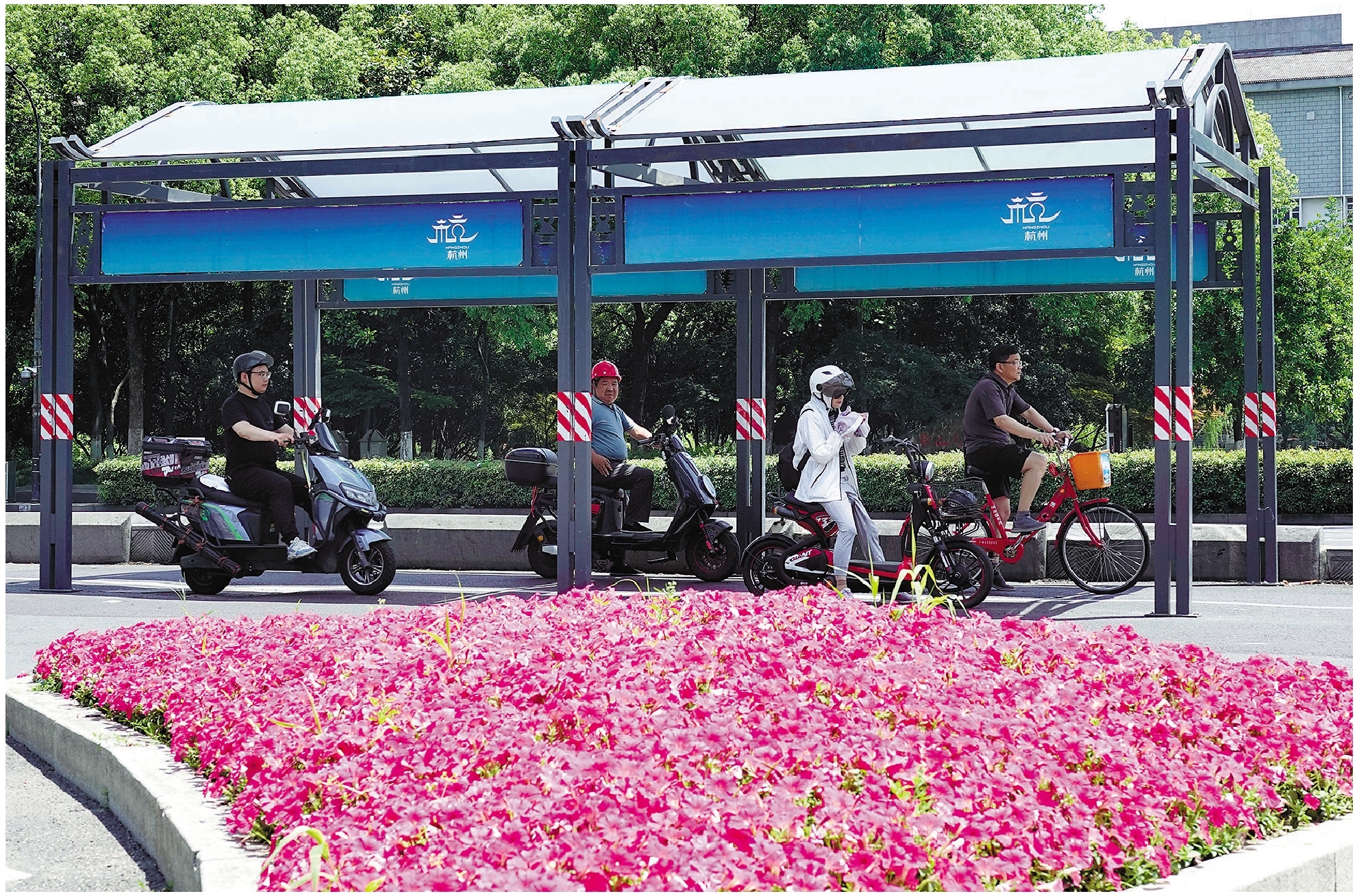 杭州日报讯 5月14日,杭州入夏第三天,主城区最高气温超过了30℃。炎炎烈日下,已陆续安装到位的非机动车道遮阳棚大显身手,为等待绿灯通行的骑车人遮出一片阴凉。