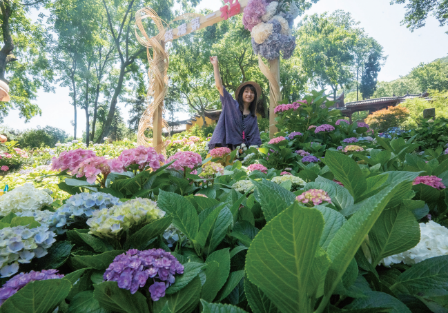 这几天,杭州永福寺的绣球花正在陆续绽放。分布在山路两侧和庭院内的绣球花,颜色层次丰富,再搭配古建筑背景别有韵味,最佳观赏期预计可持续至6月中旬。图为昨日,市民游客前来赏花打卡。