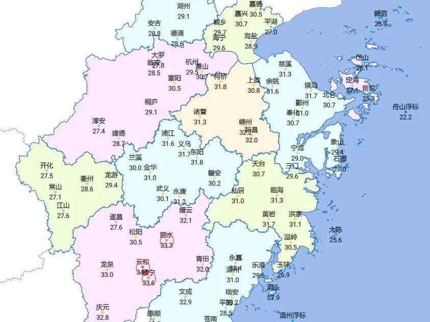 今天午后,全省气温又噌噌噌上来了,最高气温浙西北地区27-29℃,其他地区30-33℃,湿度不小,有些小闷。最高气温前三甲分别是:云和:34.8℃、景宁:33.6℃、丽水:33.3℃。