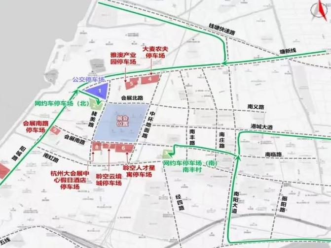 二、请前往大会展中心参加活动的市民朋友尽量乘坐地铁出行(1号线杭州大会展中心站、港城大道站抵达)。请网络预约出租车、巡游出租车至会展北路南侧杭州大会展中心P2地面停车场、会展南路南侧南丰村停车场2个专用停车场上下客;私家车可至大会展中心周边停车场停放,其中欣阳化工临时停车场、舒奇蒙临时停车场可换乘公交接驳车;过境车辆提前选择红十五线、建设四路、河庄路、青六线等周边道路绕行。