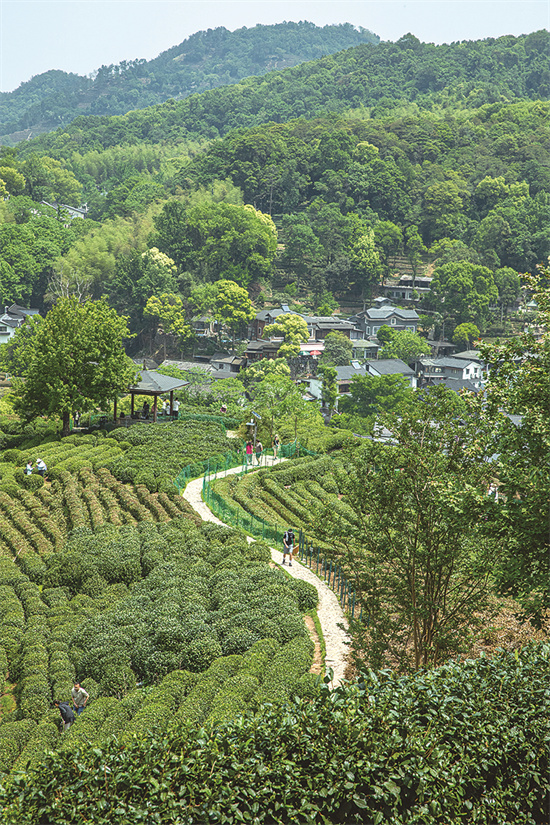 首先导航至梅家坞公交站,会看到马路对面就是“十里琅珰”的四字牌坊,穿过牌坊伴着石阶一路往上,两边是村里的茶农住家,高低错落,有些开成了民宿、茶楼,一路走到茶园,视野便开阔起来了,“登山”之行才算正式开始。