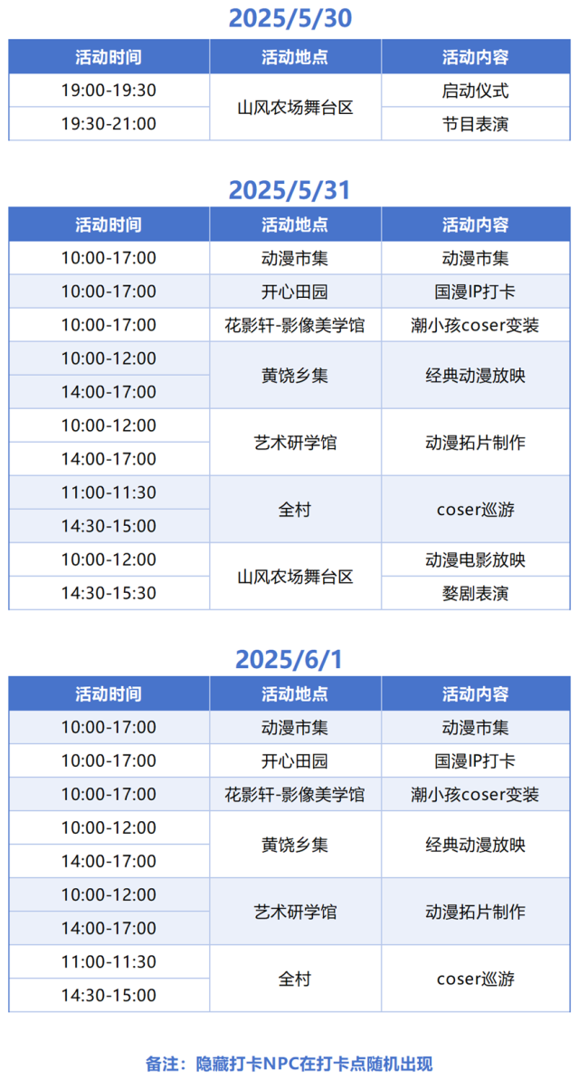 动漫之旅将串联全村,涵盖六个精心设计的打卡站点,每个站点都设有独具匠心的游戏环节,乡集为小朋友们准备了经典动漫问答,开心田园给小朋友们准备了国漫IP打卡点,花影轩则可以给小朋友们化小coser妆,来演绎一番coser走秀,艺术研学馆则可以体验动漫拓片的制作,完成所有打卡任务即可在服务台兑换超值动漫大礼包!奇遇神秘嘉宾可以获得隐藏动漫大礼包。现场有观光痛车免费搭乘哟~