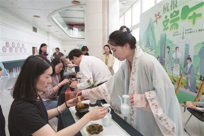 “没想到在办公楼里也能这么沉浸地过端午,包粽子、点茶、做香囊、扎艾束,每一项都亲手体验了,感觉这个节过得特别‘实’!”拿着亲手制作的艾草花束,小吴不禁感慨。