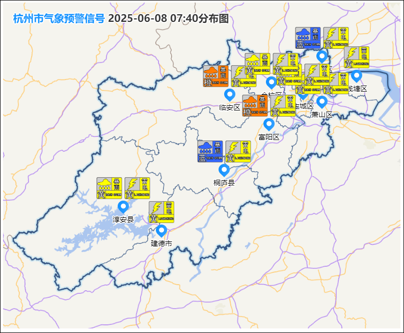 今日4点至7点31分,临安、桐庐、富阳、余杭、建德、杭州、临平、萧山、钱塘陆续发布黄色预警。其中,富阳和临安发布暴雨橙色预警。