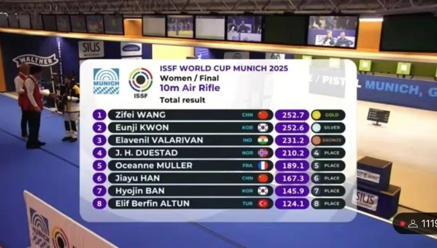 巴黎奥运会射击女子10米气步枪决赛中,黄雨婷0.1环憾负韩国选手潘孝珍,此次世界杯德国站比赛,王子菲以0.1环的优势战胜韩国选手权恩智,算是完成了“复仇之战”。