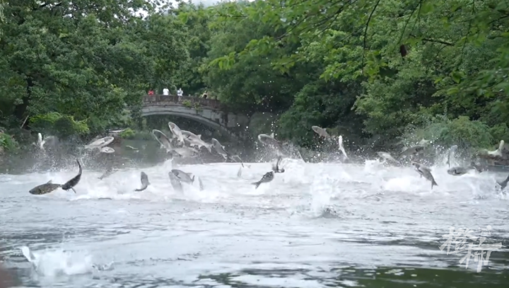 事实上,这已经不是西湖里第一次见到“飞鱼”了。6月10日,橙柿互动记者就在西湖最大出水口圣塘闸处抓拍到了“好运鲢鲢”的场景。