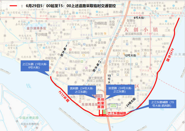 一、6月29日5:00至15:00,之江东路(1号大街-6号大街)、之江东路辅路(15号大街-凯利路)、凯利路(24号大街-之江东路)、拾里路(24号大街-之江东路)比赛线路采取分时、分段临时交通管控;同时在相邻外围道路采取分流措施。