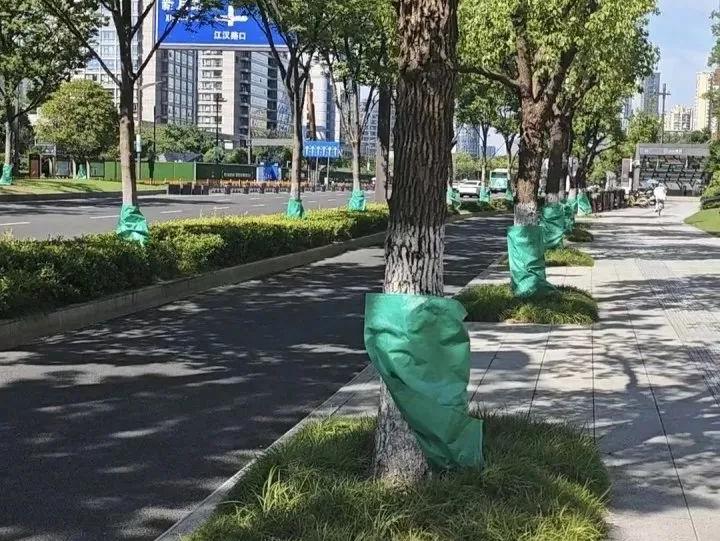 据滨江区综合行政执法局市容环卫科工作人员介绍:夏季高温,树和人一样,需要补水。过去人工或者洒水车浇灌,水可能还没渗透到树根就蒸发掉了,现在给每棵树装上水袋,袋子底下扎小孔,每天晚上,温度稍微降下来,养护人员给每棵树装满“一肚子”水,它慢慢渗漏,到了早上,水袋差不多也就空了,这也就是白天大家印象里,树怎么一直系着空的编织袋。