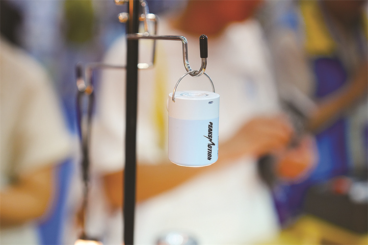 在嘉兴跃鳍科技有限公司的展位上,记者看到了一款约两根拇指大小的气泵,可随身携带,可以用来给普通气垫充气,只要20秒就能完成,充一张气床则需要3到4分钟。