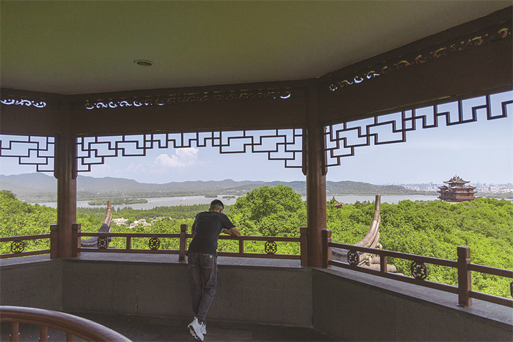 这是一座八角攒尖顶重檐十六柱二层楼阁式亭子,亭中有24级回旋式阶梯可登临远眺。天气晴好的时候,北可俯视西湖山水,南可远瞰钱塘江一线,应了亭上挂着的那副楹联——“八百里湖山知是何年图画,十万家烟火尽归此处楼台”。