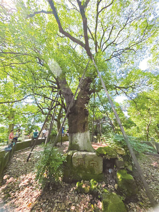 有美堂虽已不存,但历史的碎片会藏在其他角落。在遗址附近逛逛,你会发现举目皆是苍劲挺拔、翠盖如云的古樟树,其中一棵古树下的石头上还刻着“宋樟”二字。这些宋元时期就种下的古樟树也是吴山的一大特色景观。资料显示,吴山景区多古树名木,现登记在册的古树共有78棵,其中樟树最多,共49棵,而且很多都有700多岁了。相传,宋人喜种樟树,认为樟树长寿,如今看来,确实名不虚传。
