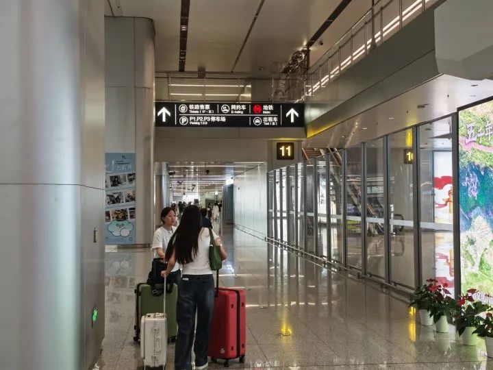 在乘客候车区,大厅宽敞明亮,有不少乘客带着箱子、提包等行李,坐在蓝色的椅子上等车。这里还有一块智慧大屏,上面标着网约车的通道和所在位置。只要乘客打到的网约车到达P2停车场,这块智慧大屏就会马上显示出车辆所在位置。
