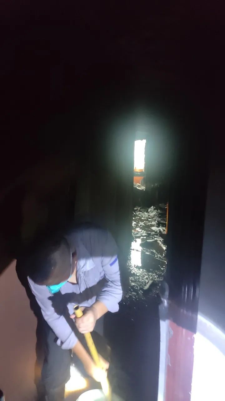 火灾现场在6楼,记者看到,起火的人家大面积被烧毁,小区物业工作人员正在清除积水,工作人员告诉记者,小孩被120送去了医院。