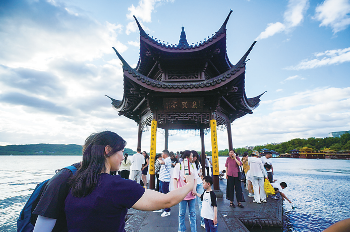 近日,杭州受到高空到低空一致的东南气流影响,天空云量很多,持续上演西湖蓝天气。湛蓝的天空,白云朵朵,空气干净,能见度特别好。图为昨天游客在西湖边游玩拍照。