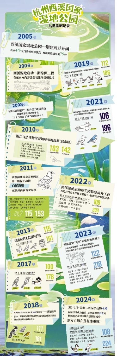 水雉的出现引出了观鸟人集聚莲花滩的盛况,这让本地鸟类爱好者感到骄傲,而这份骄傲有着更深层的底气。截至2024年底,西溪湿地累计观测记录鸟类224种,其中,3种属于国家一级保护动物,31种属于国家二级保护动物。观鸟人逐鸟而行,能在城市里、家门口看到各种珍稀鸟类,对鸟类爱好者来说是莫大的幸福。近几年,西溪湿地吸引了来自北京、上海等地的鸟类爱好者,更让本地鸟类爱好者脸上有光。