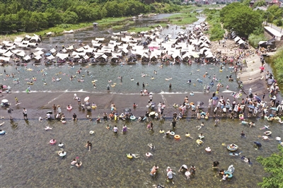 蚌潭坝上下游约1公里是嬉水区,上游是深一点的天然泳池;坝中央是一个斜坡,可以顺着水流滑到超3000平方米的消力池,“泡”在池里嬉水;下游是石滩,几十顶天幕、帐篷有序搭建,为游客提供了清凉的休憩之地。