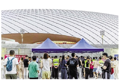 傍晚的奥体中心体育馆,热浪未消,人潮已至。“孩子买的票,我们也来赶赶时髦。”两位“妈妈级”观众正在互相拍照留念,言语间流露出兴奋之情。她们看的是伍佰演唱会,这场演出吸引了从“60后”到“00后”的各年龄段观众。