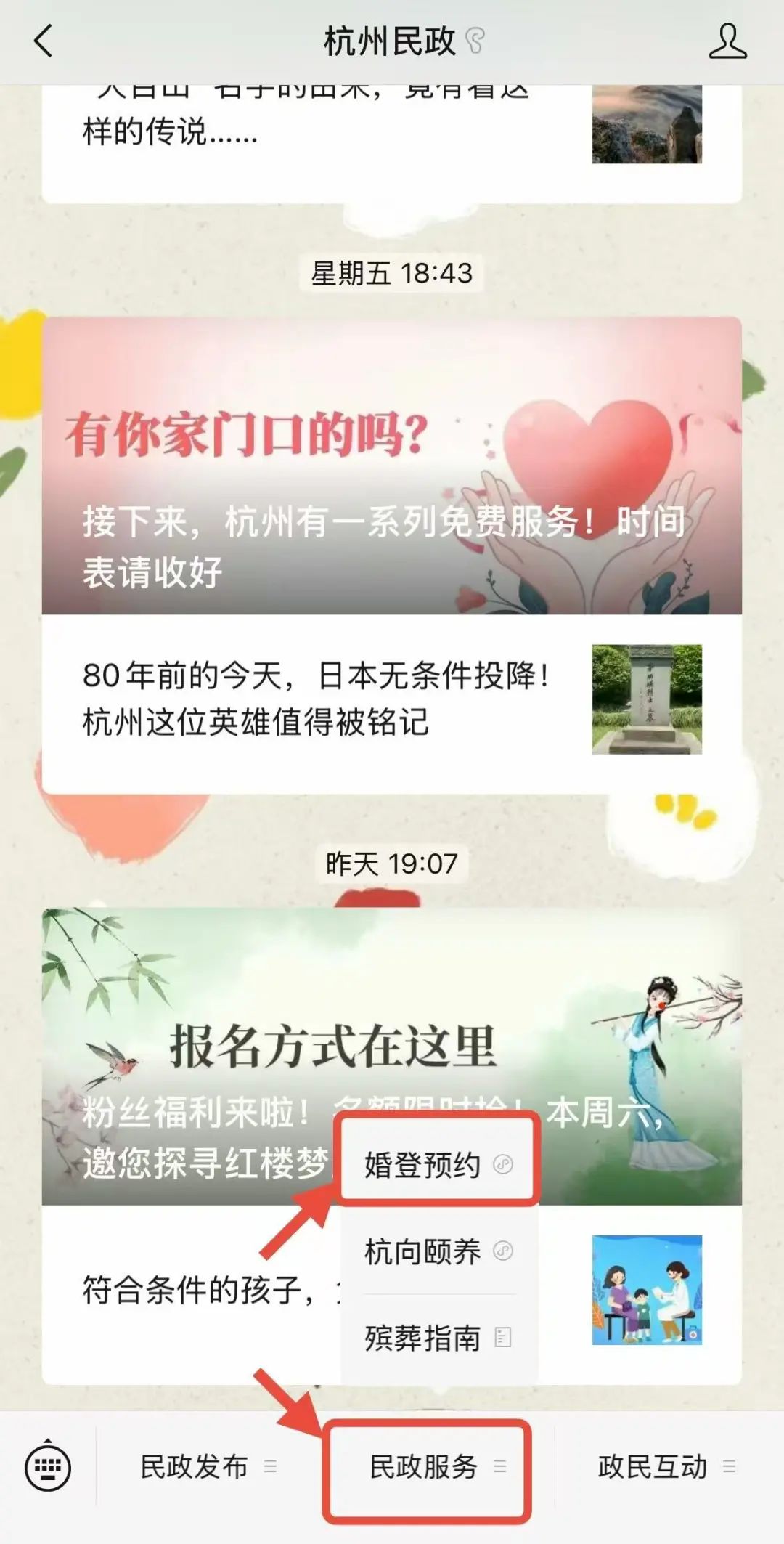 以“杭州民政”微信公众号预约步骤为例: