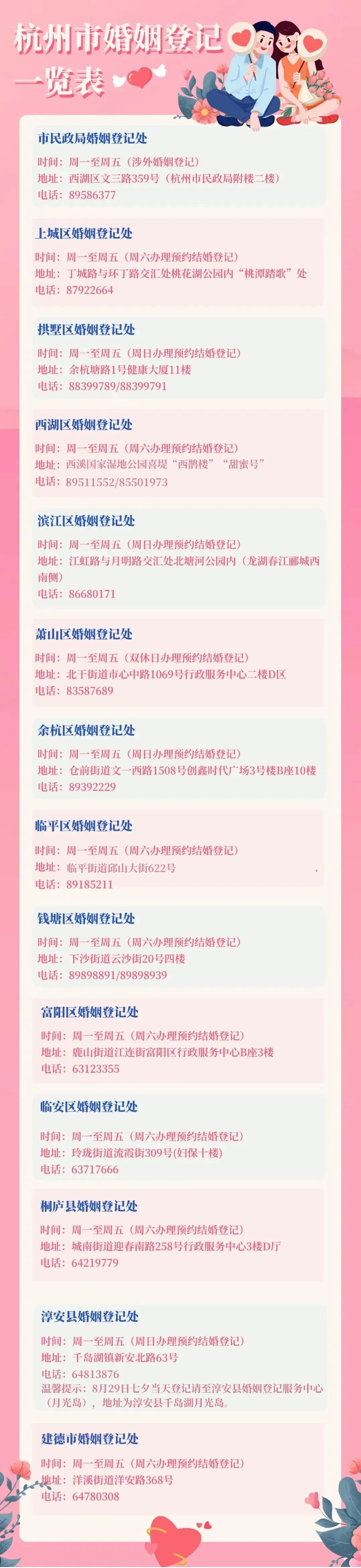 新人如有其他疑问,可拨打杭州市各婚姻登记窗口电话进一步咨询。