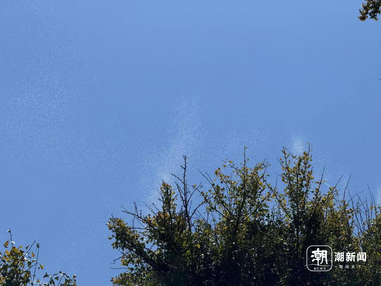 站在树下近距离观察,可以看到这些“烟”是由白色的虫群构成的,这些虫子聚集在树顶上飞舞着,而远看就像“冒烟”一样。有时一阵风吹过,虫群被吹散,但不一会儿又重新聚集起来。