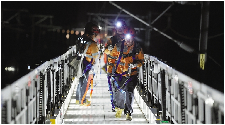 图为近日,中国铁路上海局集团公司杭州供电段检修人员在凌晨对杭台高铁接触网等设备进行集中检修,保障线路持续稳定运行。