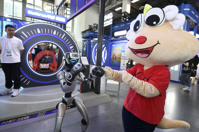 在不久前落幕的第二十一届中国国际动漫节上,玩偶在和人形机器人互动。