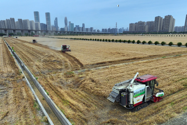 5月末6月初,在萧山区“世纪田园”里,小麦开镰收割,金黄的田野与飞驰而过的高铁、鳞次栉比的高楼共同构成一幅壮美的都市田园丰收画卷。