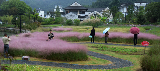 在萧山区欢潭古村口,游客在“网红打卡点”粉黛乱子草里拍照留念。相传南宋名将岳飞率军抗金曾途经此地,将士饮潭水而欢,故得名“欢潭”。村子至今还保存着完整的古建筑群和老街区,是浙江省历史文化村落保护利用重点村和美丽乡村建设的样板村。