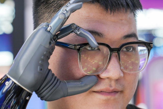 7月17日,在第三届链博会数字科技链展区,强脑科技公司一名右手残疾的工作人员在佩戴了BrainCo智能仿生手后摘取眼镜。