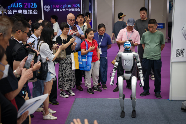 4月24日,在深圳会展中心,参观者在首届机器人全产业链接会上的宇树科技展台观看人形机器人展示。