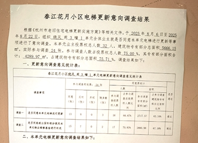 月华苑4幢4单元一位业主认为,《杭州市老旧住宅电梯更新实施方案》(杭房局〔2024〕47号文件)中有明确要求,“实施步骤”第一条“开展需求摸排”,第二条“统一更新意愿”。第二条的第一步是“提出更新建议”,第二步是“实施安全评估”——“相关业主或受委托的业主委员会、物业服务企业,委托具有电梯监督检验资质或型式试验资质的机构对老旧住宅电梯进行安全评估。安全评估机构出具评估报告,明确评估结论,提出一般修理、重大修理、改造、更新等整改建议。评估结论张贴在电梯轿厢内或者该单元出入口处的显著位置,并报送所在社区。”