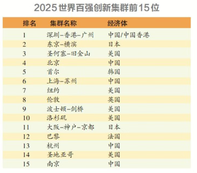 今年,中国有2个集群(深圳-香港-广州和北京)跻身前5位,25个集群进入全球百强,仍是拥有世界上最多创新集群的经济体,在顶尖创新集群数量上连续三年领先。
