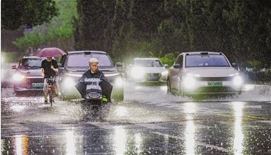 9月2日下午3时,杭州市部分地区出现短时暴雨。图为市民在暴雨中骑行。 本报记者 徐彦 摄