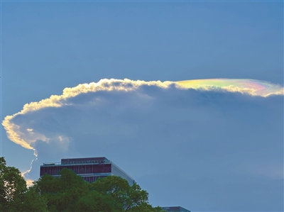 天气有多热,天空就有多美。昨天,杭州上空惊现“七彩祥云”,也就是环地平弧,又称日载、日承。这个现象一般出现在夏季中午前后,主要发生在中纬度地区,它的形成条件比较苛刻,高空要有卷云层,且含有大量六边形板状冰晶近乎水平排列,以充当有效的折射棱镜。正因为概率比较低,所以难得一见。