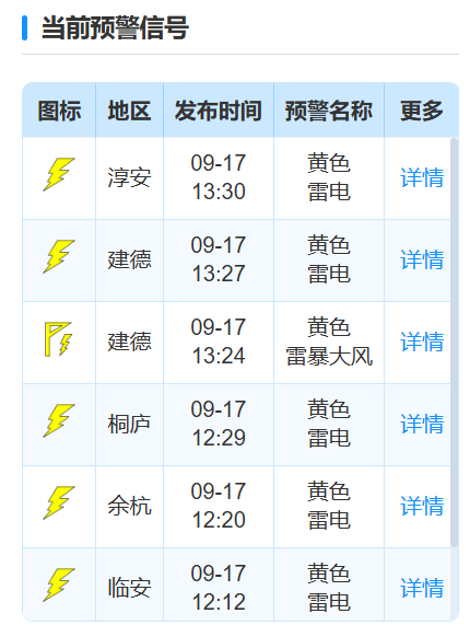 截至目前,杭州多地已发布雷电、雷暴大风黄色预警