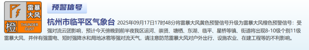 杭州市临平区气象台2025年09月17日17时48分将雷暴大风黄色预警信号升级为雷暴大风橙色预警信号: