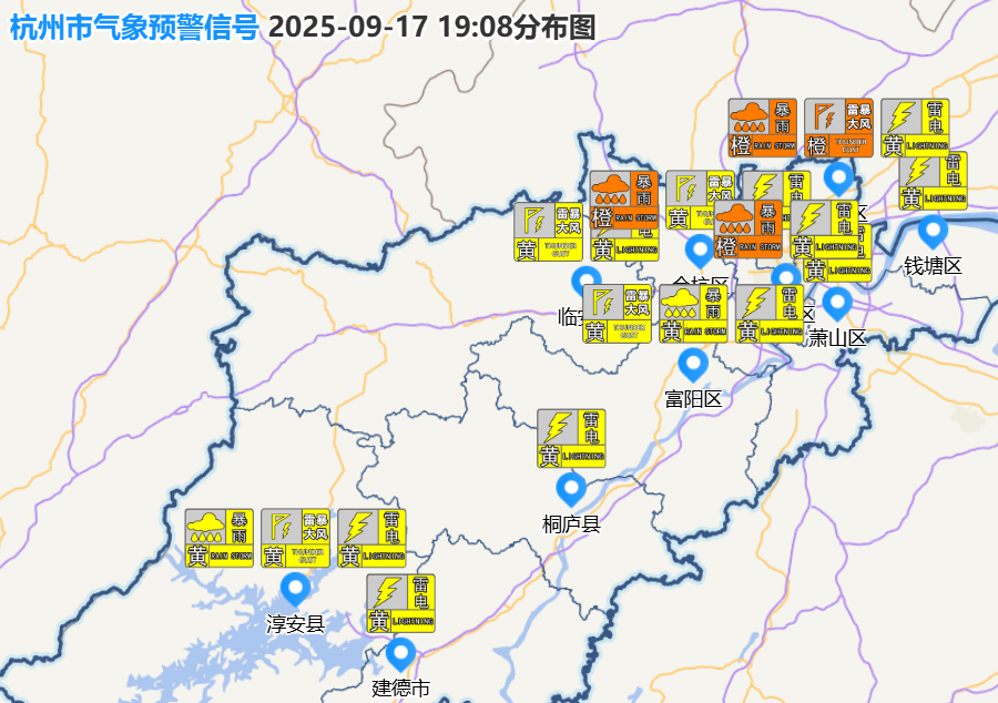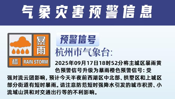 杭州市气象台2025年09月17日18时52分将主城区暴雨黄色预警信号升级为暴雨橙色预警信号:
