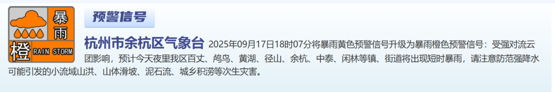 杭州市余杭区气象台2025年09月17日18时07分将暴雨黄色预警信号升级为暴雨橙色预警信号: