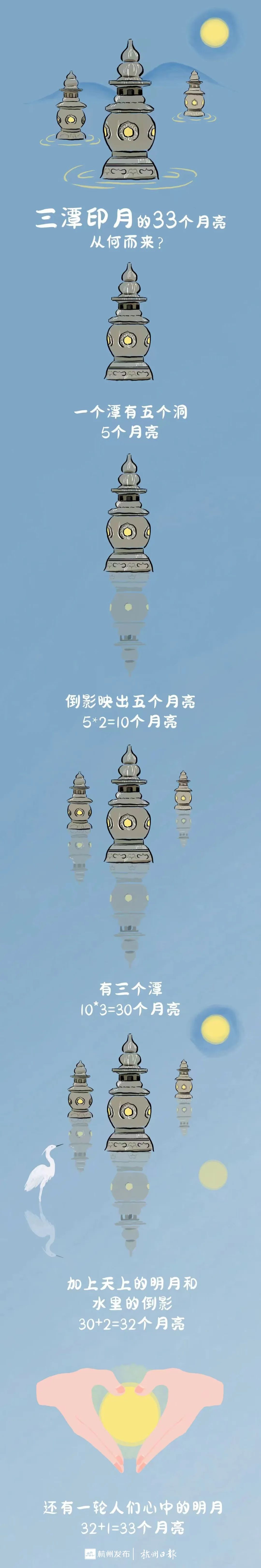 中秋圆月高悬时,“三潭印月”三座小石塔里各有5个小月亮,三座塔就是15个,加上倒映在水里的,那就是30个月亮。