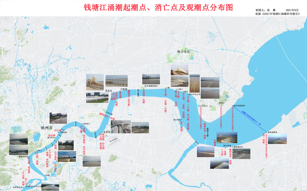 钱塘江的潮型潮景丰富多样,分布在从海宁到杭州的钱塘江沿岸。