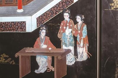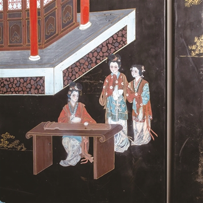 款彩漆器色彩鲜艳,整体画面比雕漆更为灵动,因此才是“倩盼之美”,刻画人物场景的效果极好,因此也更适合在大屏的漆屏风上展示整体的画面。
