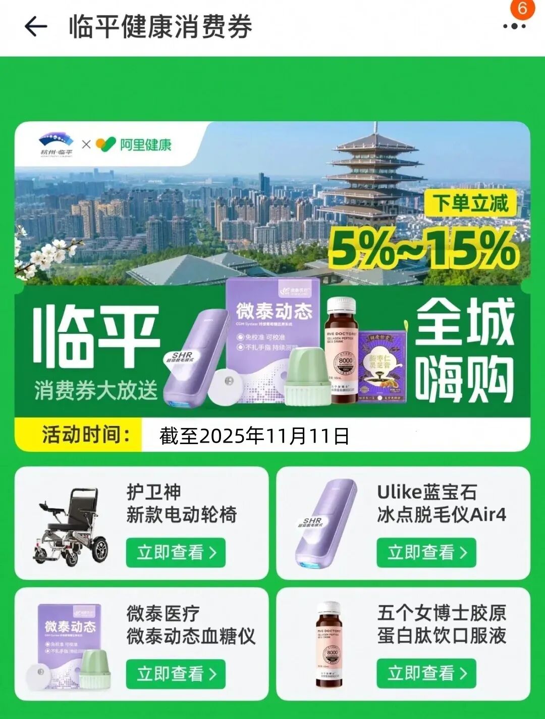 消费者打开天猫/淘宝APP,搜索“临平健康消费券”,进入临平健康消费券会场,在会场展示商品的详情页面,直接下单立减,立减比例5%~15%。