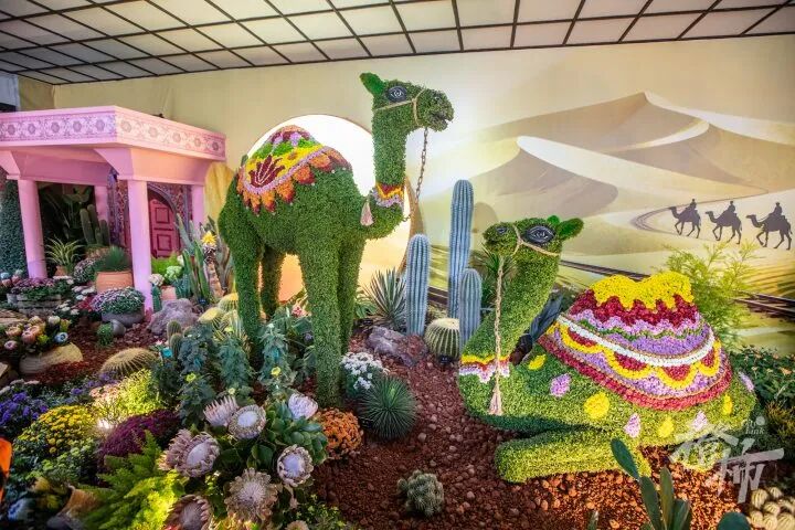现场还有一组由杭州西湖风景名胜区凤凰山管理处设计的“丝路”主题作品,将杭州西站作为“一带一路”关键枢纽,设计了一个货运火车及新疆小院落景观,车头昂扬,满载各色菊花,沙丘起伏、骆驼徐行,除了菊花之外,还有许多仙人掌等沙地植物。