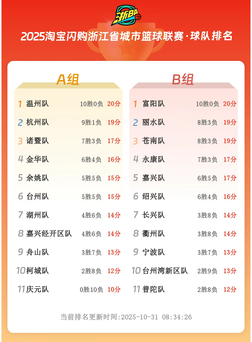 富阳队以十连胜领跑B组积分榜